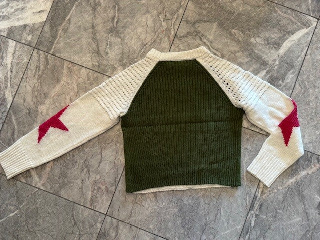 White cableknit long sleeve sweater featuring contrast green panels and playful pink stars scattered across the sleeves. The classic cable knit texture adds depth and visual interest, while the color-blocking design—crisp white base with bold green accents—creates a modern, eye-catching look. Perfect for layering or wearing solo, this piece brings an effortless cool factor to any casual wardrobe. The star details add a touch of personality without being over the top, making it versatile enough to pair with your favorite jeans or dress it up with tailored pieces.