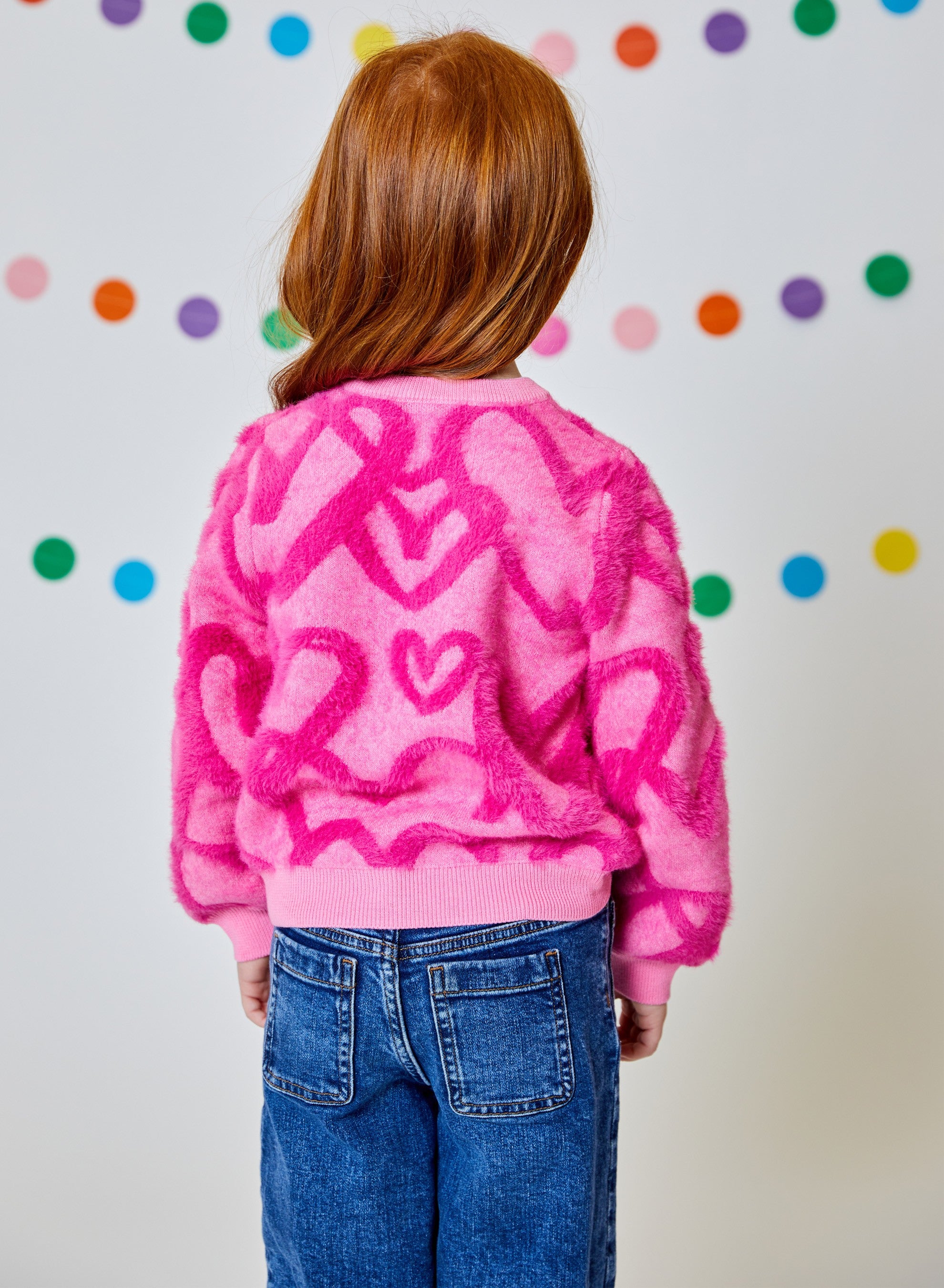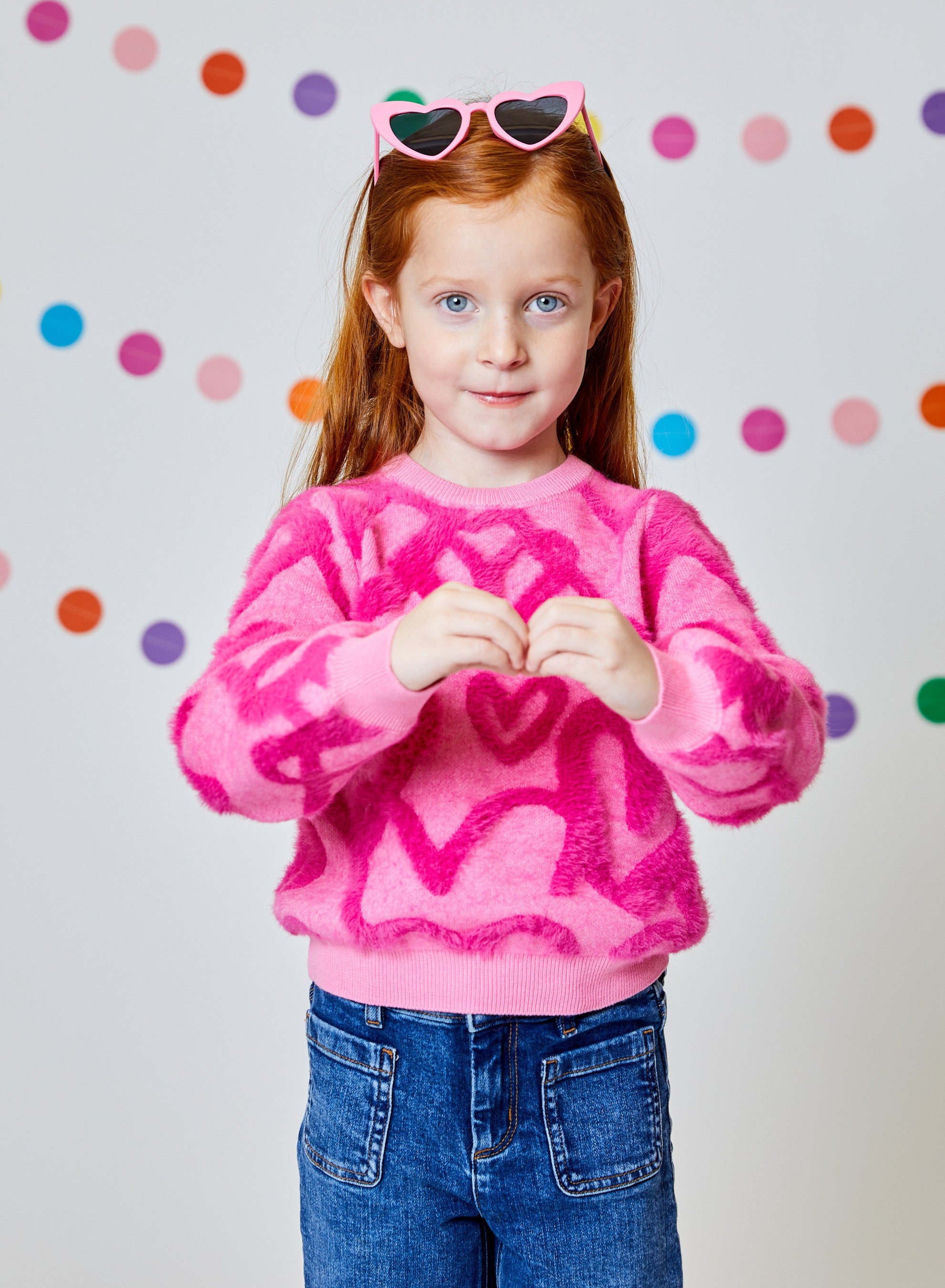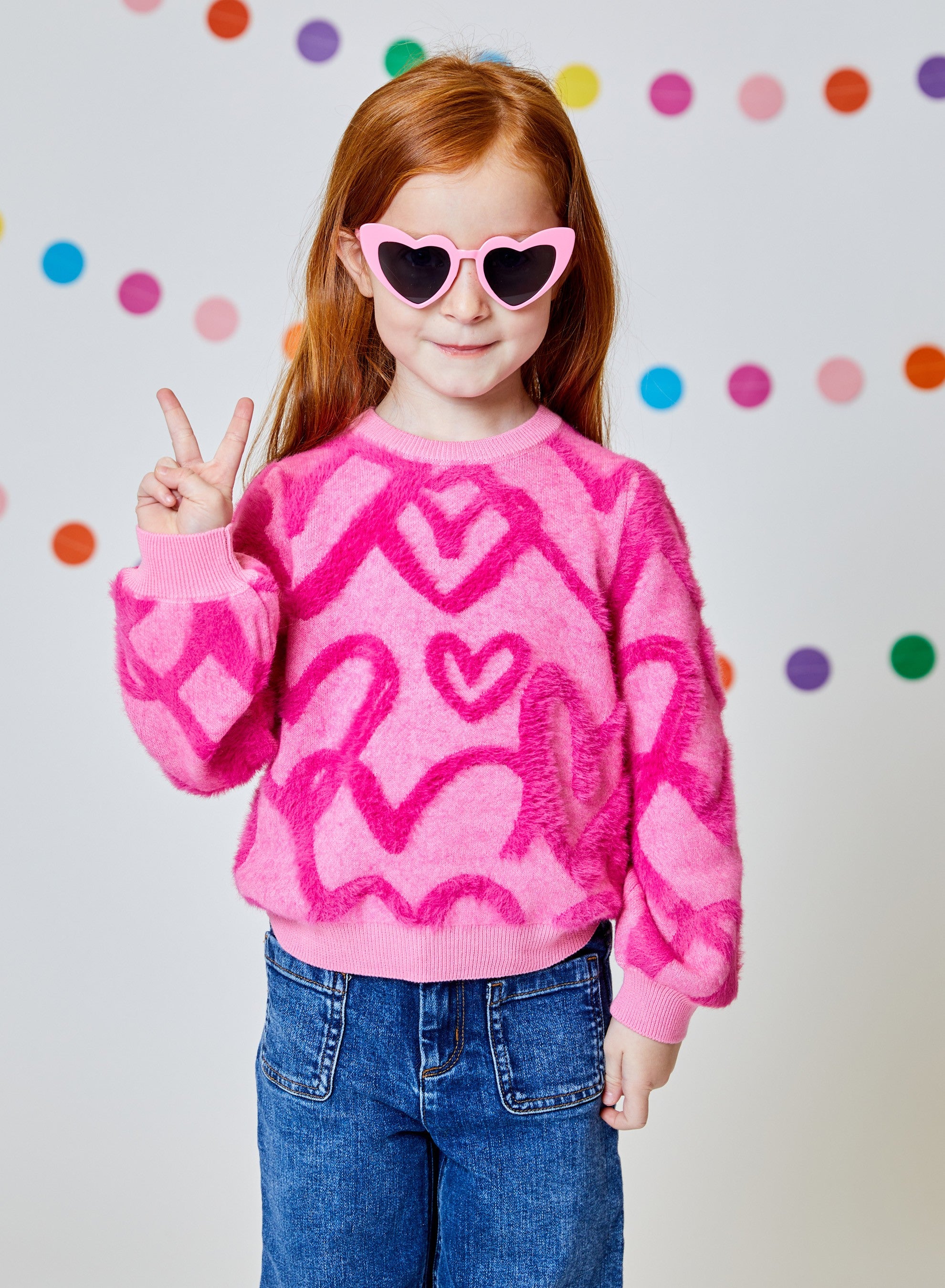 Embrace cozy charm with the DH Pink Heart Fuzzy Sweater, designed for a playful yet stylish look. This long sleeve sweater features soft pink fabric adorned with fuzzy pink-outlined hearts that add a touch of fun and texture. The flattering tab waist creates a subtle shape, making it perfect for pairing with your favorite jeans or skirts. Whether you're out with friends or relaxing at home, this sweater brings a girly cool vibe to your wardrobe while keeping you comfortably warm all day long. Model wears a size 6 for a true-to-fit style.