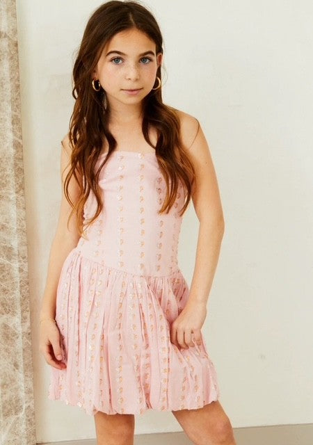 Turn heads in this striking pink dress featuring an eye-catching lurex heart print that catches the light with every move. The playful bubble hem adds dimension and movement, while adjustable straps ensure a custom fit for your frame. A smooth zipper closure makes getting dressed effortless. Whether you're heading to a night out or a special occasion, this piece delivers bold style with an undeniable cool factor. The model pictured wears a size medium for reference on fit.
