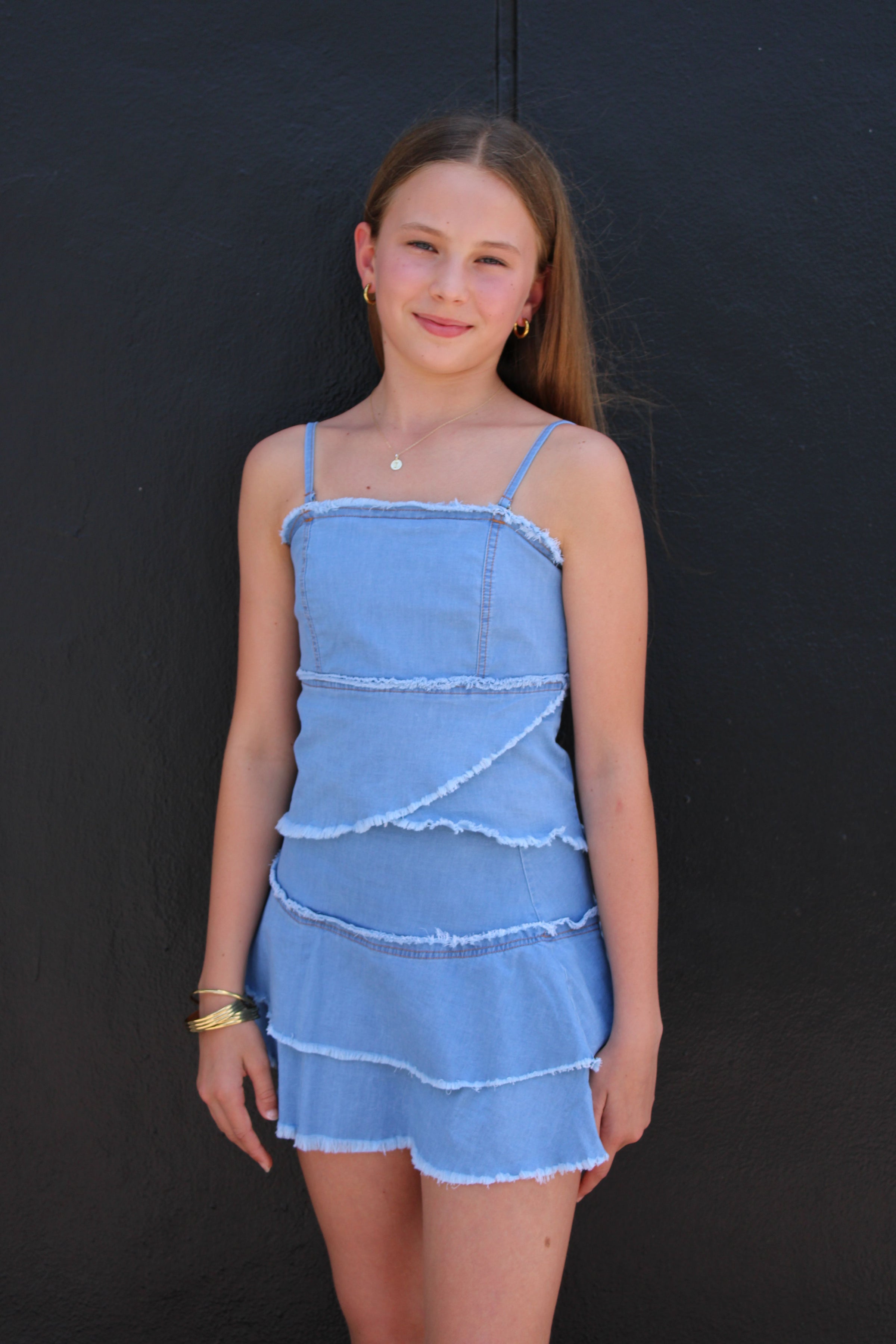 Light wash denim top featuring a playful frayed detail and asymmetric hem that adds movement and edge to your everyday look. The back zipper closure and adjustable straps offer both style and comfort, allowing you to customize the fit to perfection. Layer it solo for a casual vibe or pair it with the IS Frayed Denim Skirt to create a coordinated set that's effortlessly cool. Model wears a size 14k.