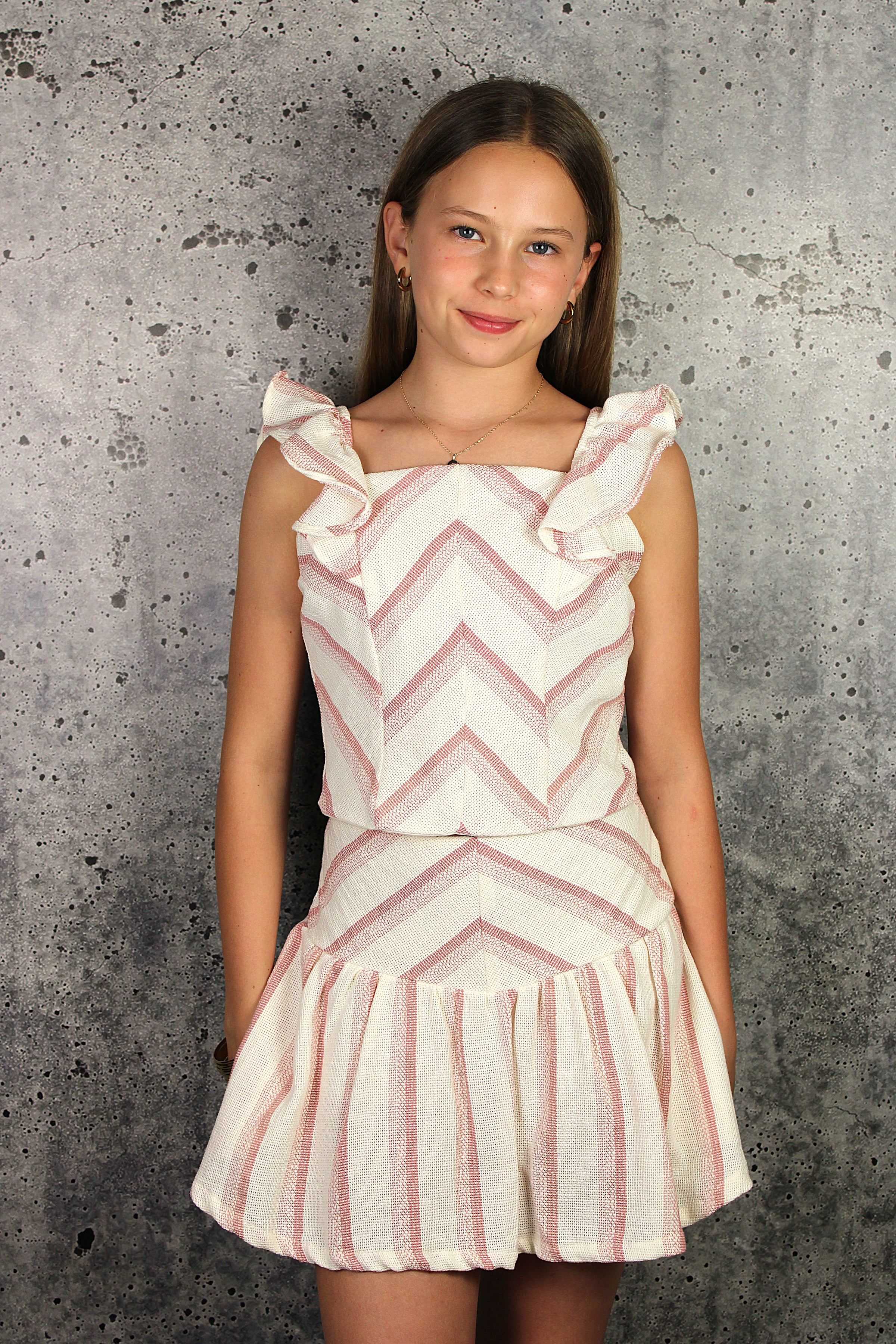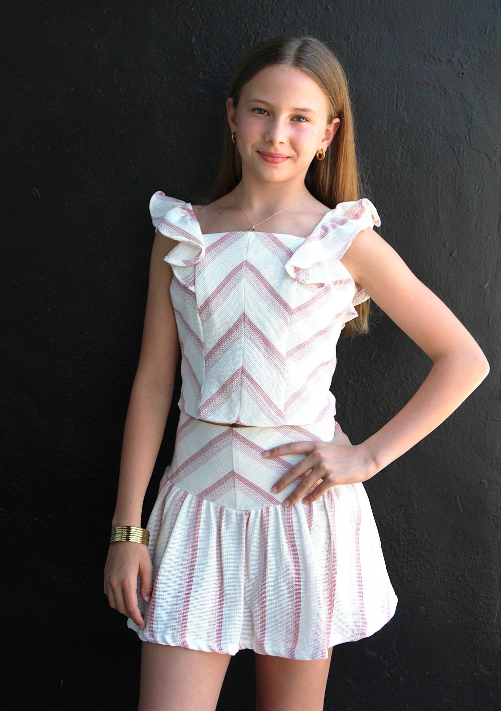 Playful red and white stripes define this mid-rise skort, complete with a flirty ruffle hem and secure zipper closure. Hidden shorts underneath keep you covered for all-day comfort and movement. Style it solo or pair with the matching IS Red Stripe Top for a coordinated look. Model pictured in size 14k.