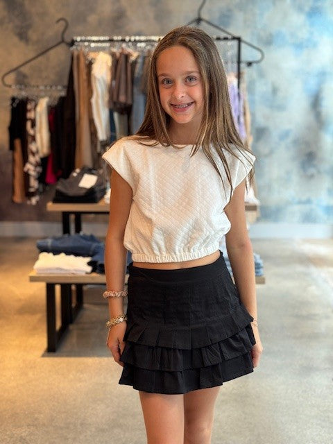 This white quilted top combines comfort and style effortlessly with its playful cap sleeves and flattering elastic waist that cinches gently to highlight your silhouette. The quilted texture adds a touch of cozy sophistication, making it perfect for both casual days and dressier outings. Designed for ease and movement, it pairs beautifully with your favorite jeans or skirts. The model wears a size 10, showcasing a fit that balances relaxed and chic, perfect for adding a girly cool vibe to your wardrobe.