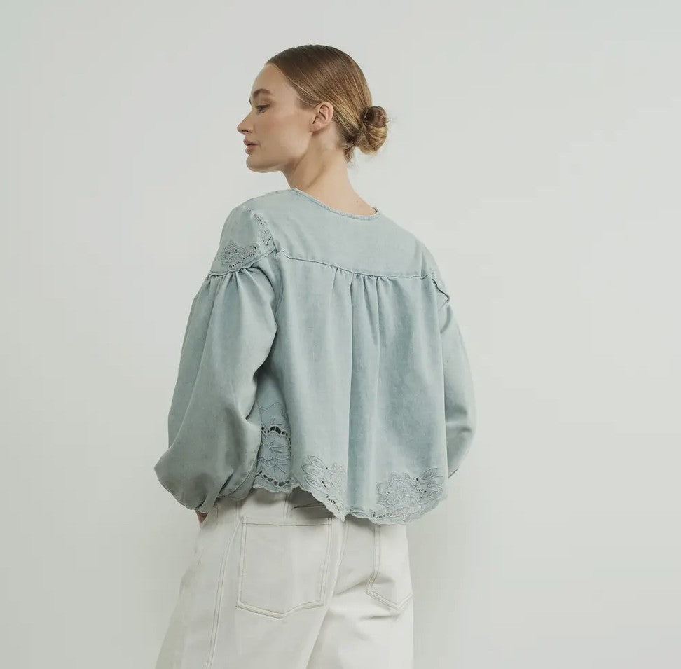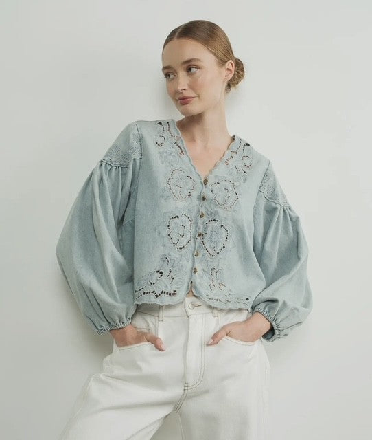 Denim blue v-neck top featuring delicate embroidery details that add a touch of feminine charm. Long peasant sleeves with a relaxed, flowy silhouette create an effortlessly chic vibe perfect for casual outings or dressed-up occasions. Front button closure allows for easy layering and styling versatility. The soft, breathable fabric feels amazing against the skin, while the classic denim hue pairs beautifully with everything in your wardrobe. Model wears a size small. Whether you're heading to brunch with friends or a weekend getaway, this top is your new go-to piece for looking put-together and feeling fabulous.