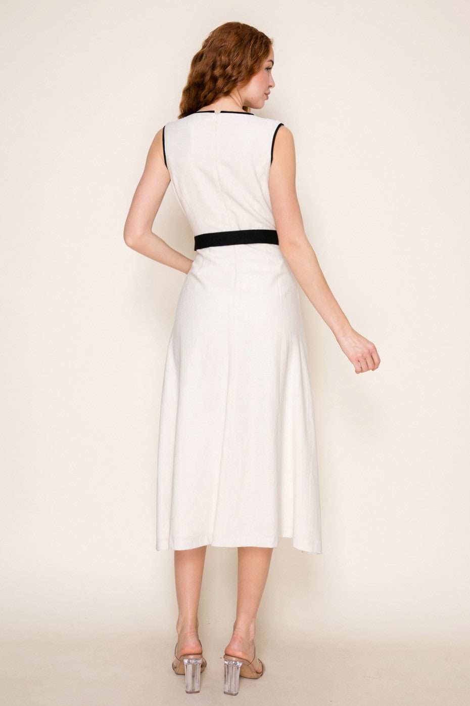 Effortless elegance meets everyday versatility in this white wrap midi dress. The sleeveless V-neckline flatters while the button closure ensures a secure fit, and the contrasting black belt defines your silhouette beautifully. Perfect for transitioning from office to evening, this timeless piece pairs easily with heels, flats, or sneakers. Model pictured wears size small.