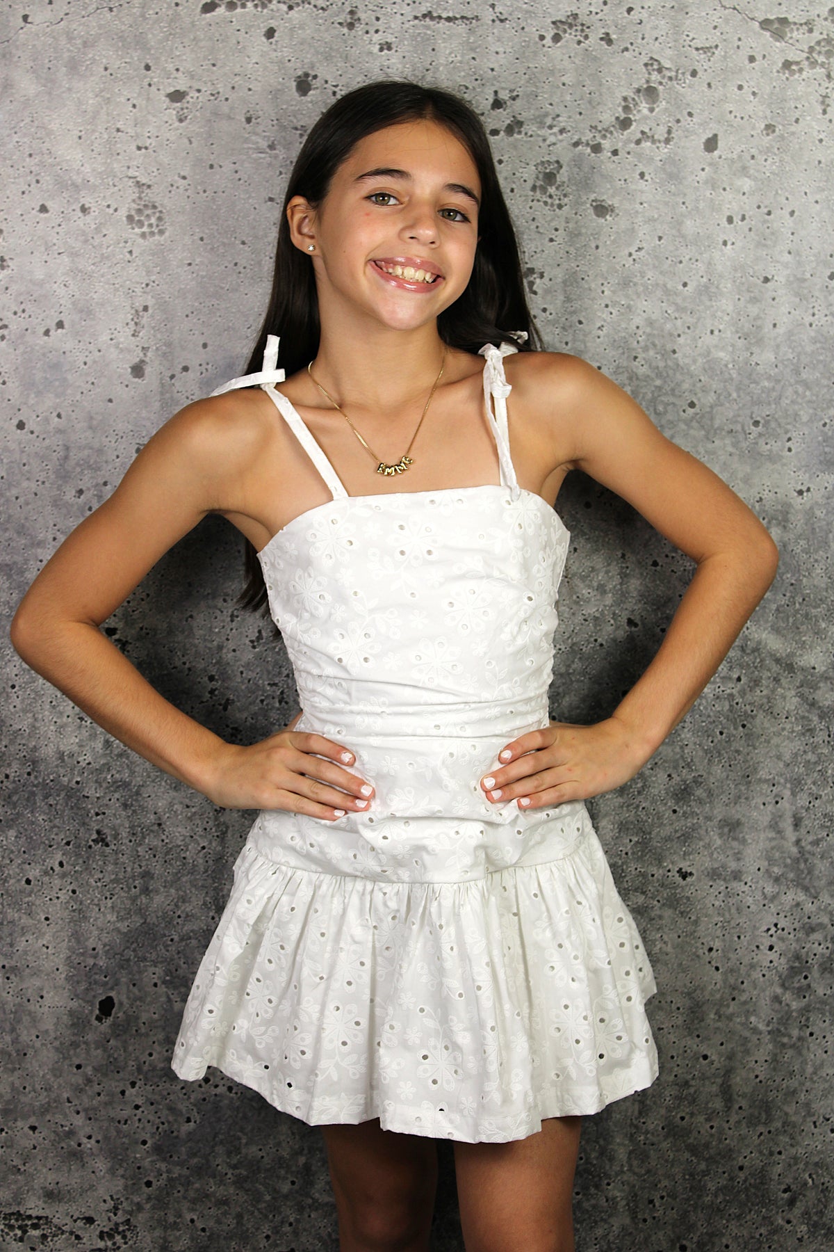 This IS White Eyelet Gathered Dress is your go-to for that effortless, cute aesthetic. Crafted in soft pink eyelet fabric, it features side gathering for a flattering fit and adjustable tie straps you can customize to your comfort level. The ruffled skirt brings playful movement to every step, while a hidden back zipper keeps things sleek and streamlined. See how it looks on our model in size 10k—the perfect reference for finding your ideal fit. Whether you're heading to brunch, a garden party, or just want to feel polished and put-together, this dress delivers girly-cool charm with serious style credentials.