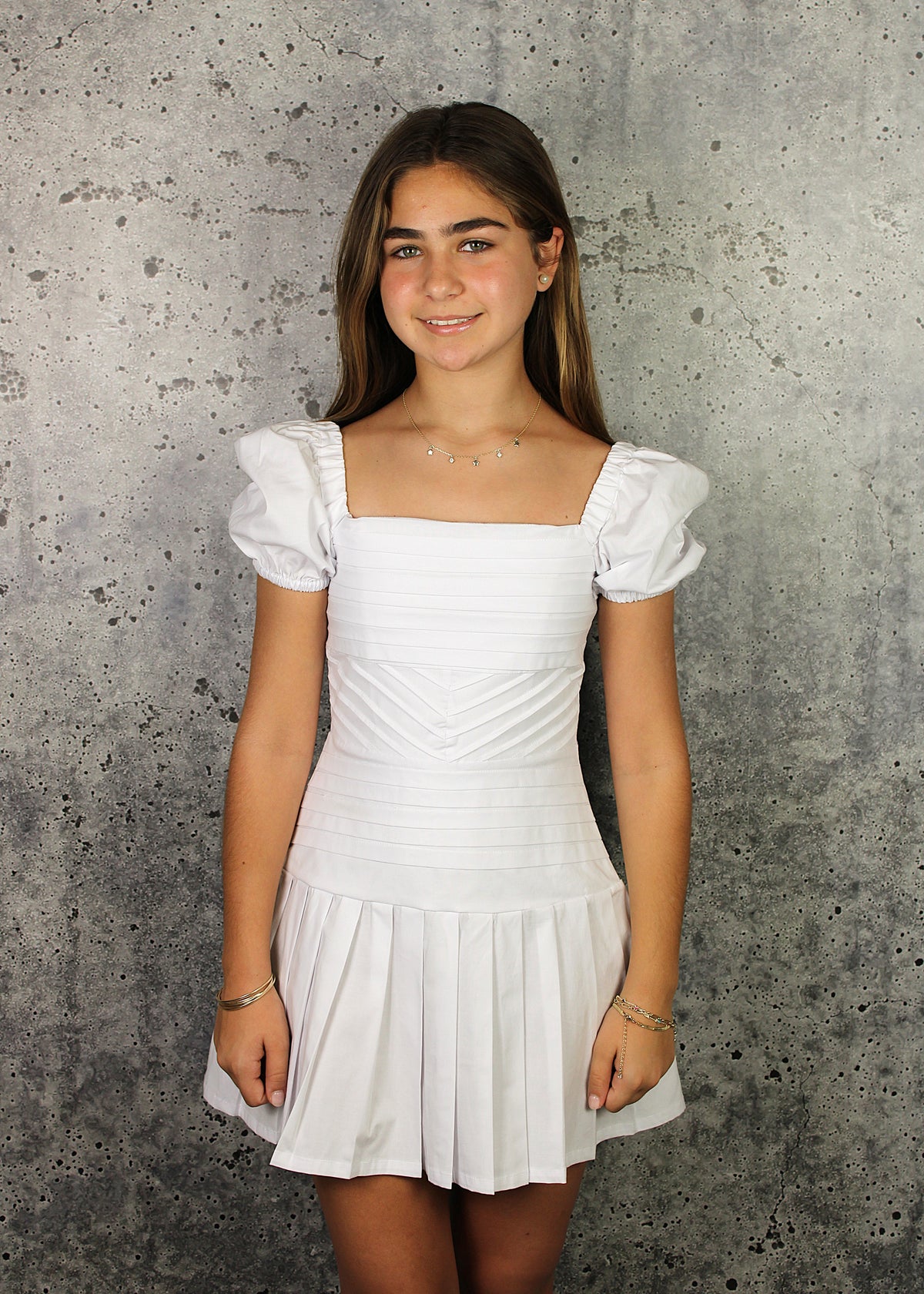 Crisp white pleated dress featuring short puff sleeves and a flattering A-line silhouette. The structured pleated skirt offers movement and elegance, while a discreet back zipper ensures a seamless fit. Perfect for spring occasions, brunch, or layered styling. Model pictured in size 12.
