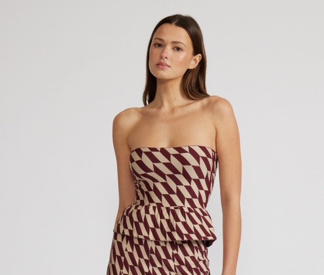 Elevate your style with the LP Wine Print Strapless Top, featuring a striking wine and beige print that adds a unique edge to your wardrobe. The strapless design offers a sleek, modern silhouette, perfect for showing off your shoulders and pairing effortlessly with your favorite bottoms. The peplum hem adds a flirty, feminine flair while accentuating your waist for a flattering fit. Whether you're dressing up for a night out or keeping it casual, this top blends comfort and cool sophistication with ease. Model wears a size small for reference.