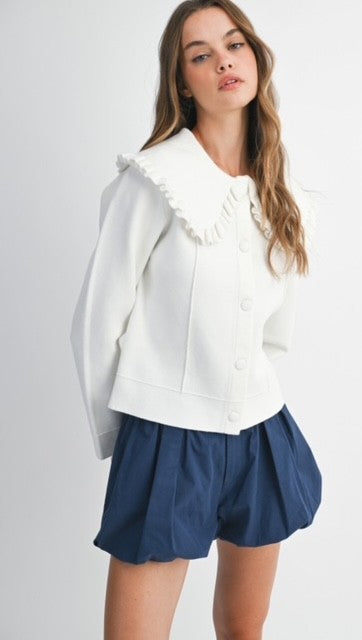 Crafted with precision, the MA Navy Bubble Short offers a sophisticated take on casual summer wear. These shorts feature a tailored mid-rise waist that ensures a comfortable yet structured fit, accentuating the natural silhouette. The distinctive bubble hem adds subtle volume and movement, providing a modern twist to a classic shape. Finished with a secure button and zipper closure, they combine practical functionality with refined style. The deep navy color lends versatility, making these shorts a staple piece easy to pair with both casual and elevated looks. Modeled here in size small to highlight their flattering design and expert craftsmanship.