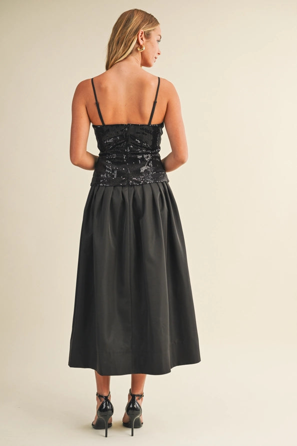 Make a statement in this striking black sequin maxi dress. The glittering sequin bodice creates instant drama and dimension, while the contrasting velvet skirt grounds the look with understated elegance. Adjustable and removeable straps let you dial in the perfect fit, and a smooth zipper closure keeps things practical without sacrificing style. Layer it over a slip or wear it solo—either way, you've got a versatile piece that transitions from cocktail hour to late-night dancing. The model shown wears a size small.