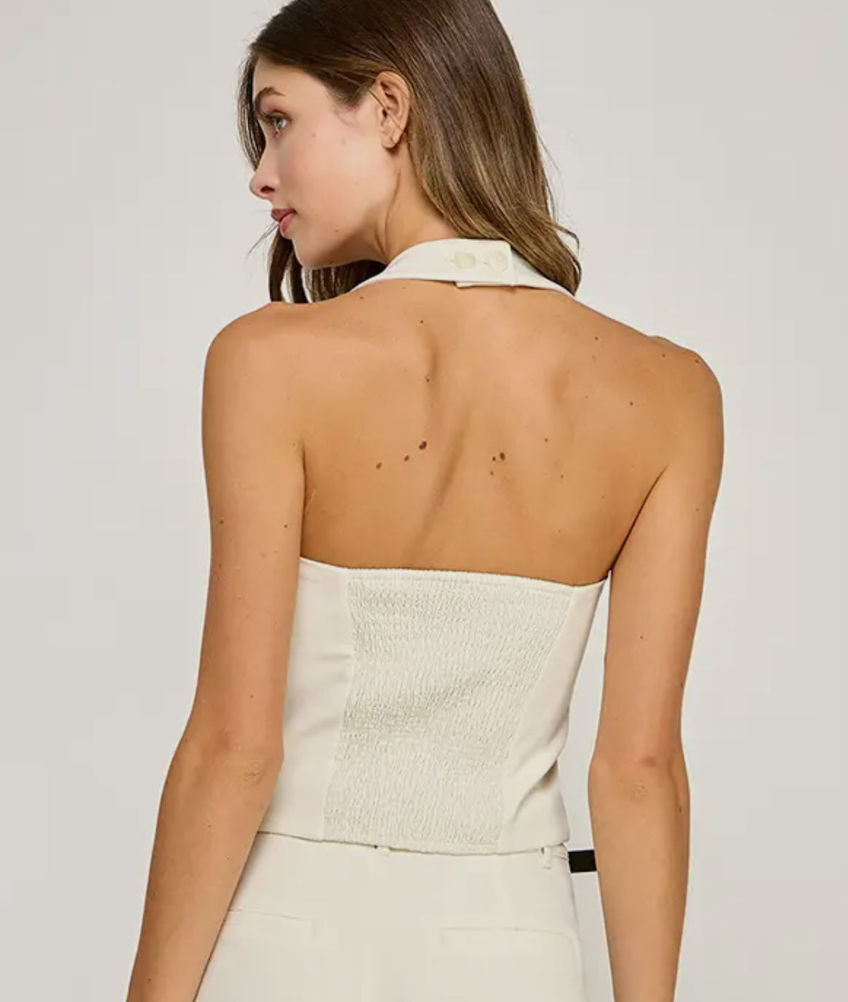 An essential addition to your summer wardrobe. This white halter top is designed with a smocked back and button closure on neck for lasting comfort and effortless style. Pair it with your favorite shorts for an easy and chic look.