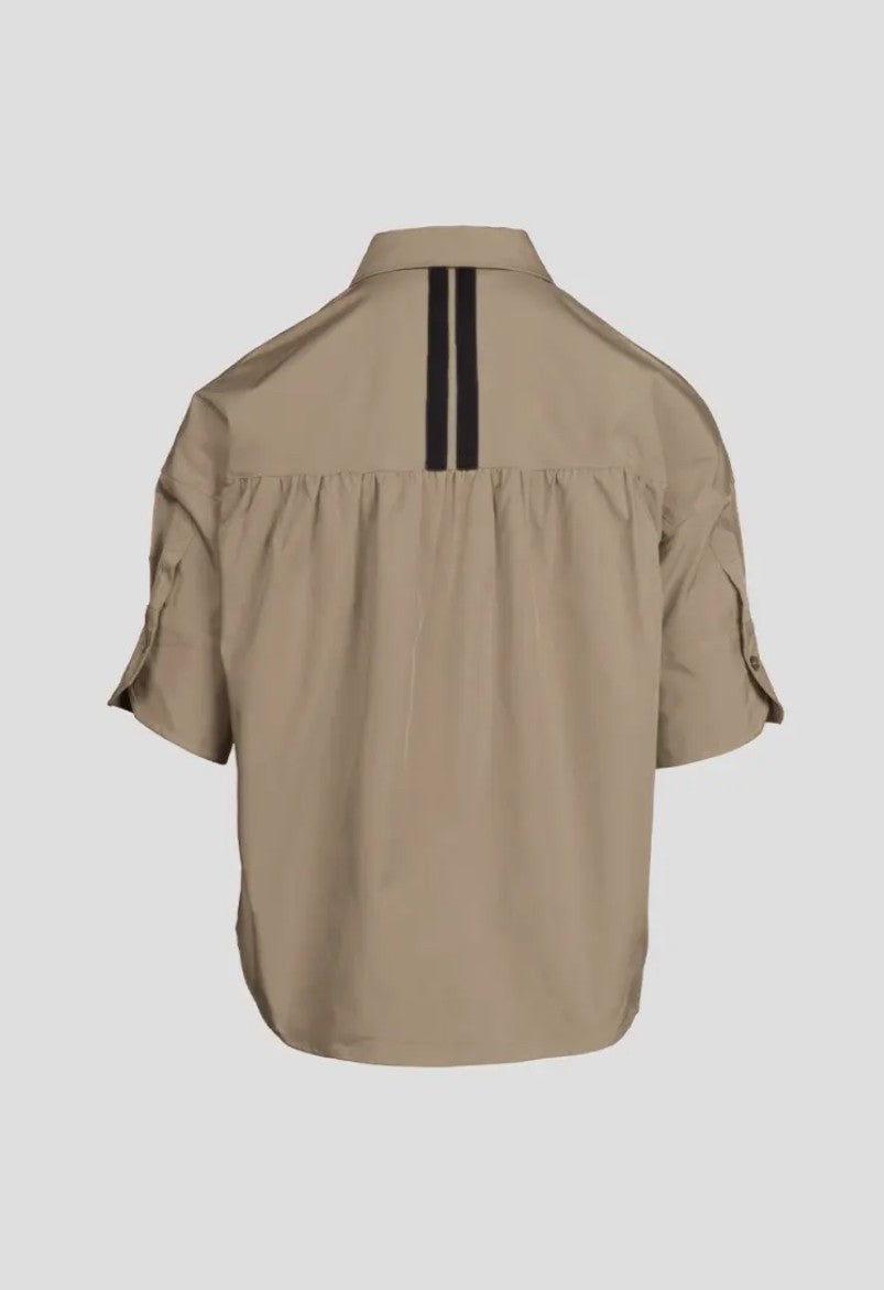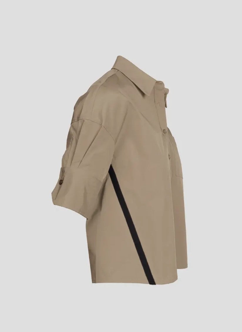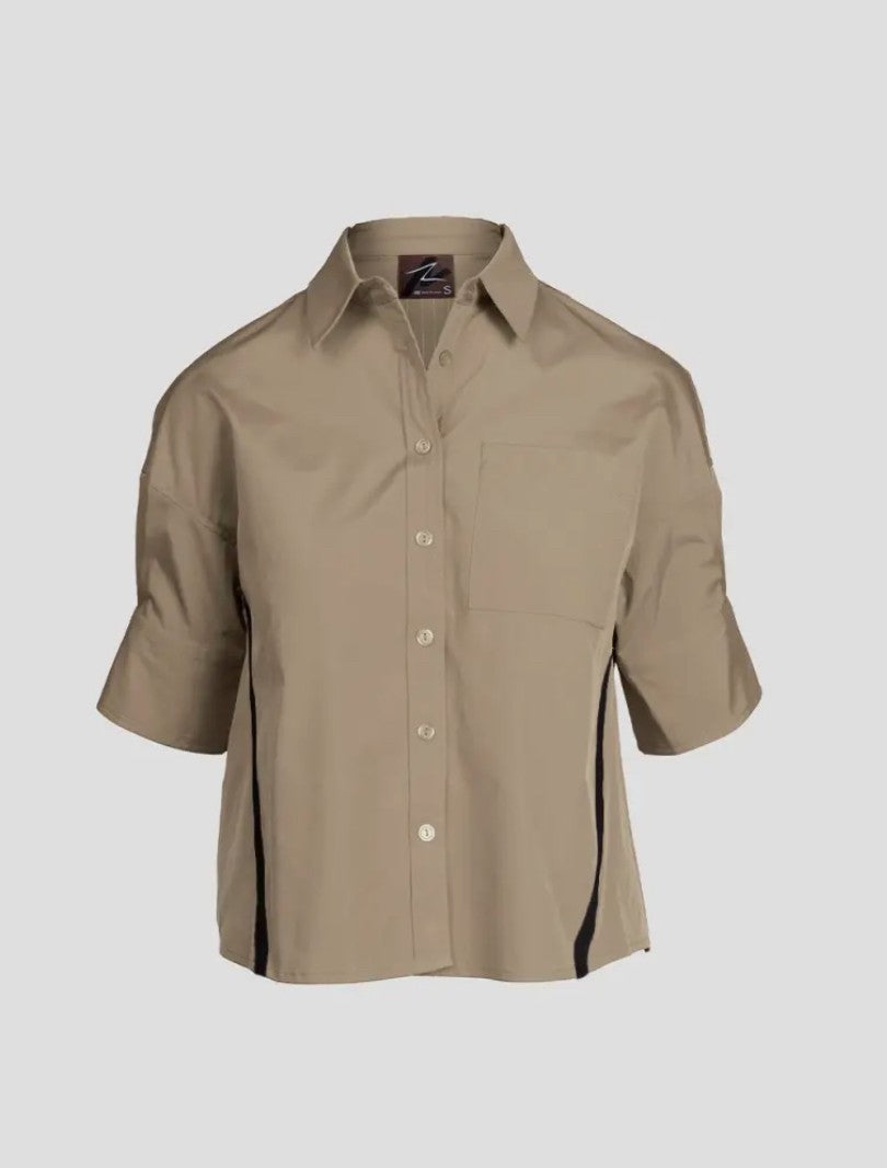 This beige short sleeve button-down top stands out with its sleek black side and back stripe, adding a modern edge to a classic design. The back features a subtle ruffled detail that brings a playful touch, while the cuffed sleeves with button closures keep it sharp and polished. Perfect for effortless layering or wearing on its own, this versatile piece blends comfort with style. Designed for ease and a flattering fit, it’s an ideal choice to elevate your everyday wardrobe with a cool, contemporary vibe. The model is pictured wearing a size small for reference.