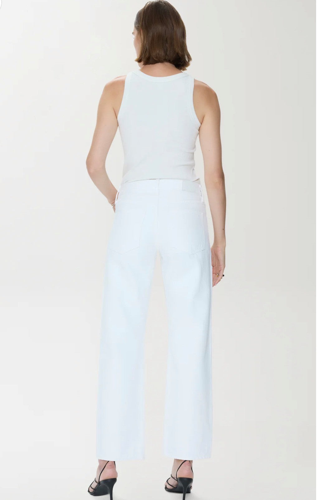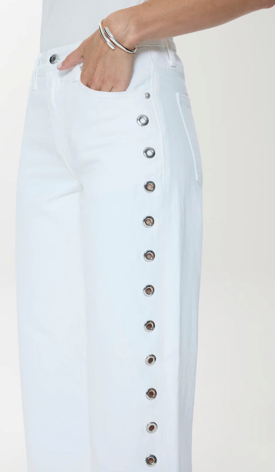 The PD Lexi Vivid White Jean features a flattering mid-rise cut with a bowed straight leg silhouette that skims the body for an effortless, modern look. Distinctive grommet details line the sides, adding an edgy touch to this versatile classic. Crafted for comfort and style, these jeans transition seamlessly from casual weekends to dressed-up occasions. The model pictured wears a size 26, showcasing how the fit hugs in all the right places while maintaining that coveted straight-leg shape.