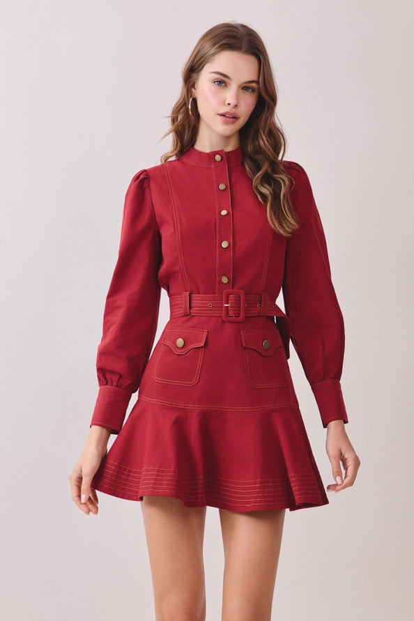 Crimson long sleeve mock neck dress designed with understated sophistication. Features contrast topstitching that adds visual interest, a functional front button closure, and an adjustable belt to customize your silhouette. The mock neck provides a polished, layered look that works solo or under jackets. Crafted for effortless styling, this piece transitions seamlessly from casual weekdays to elevated evenings. Model pictured wears size small.