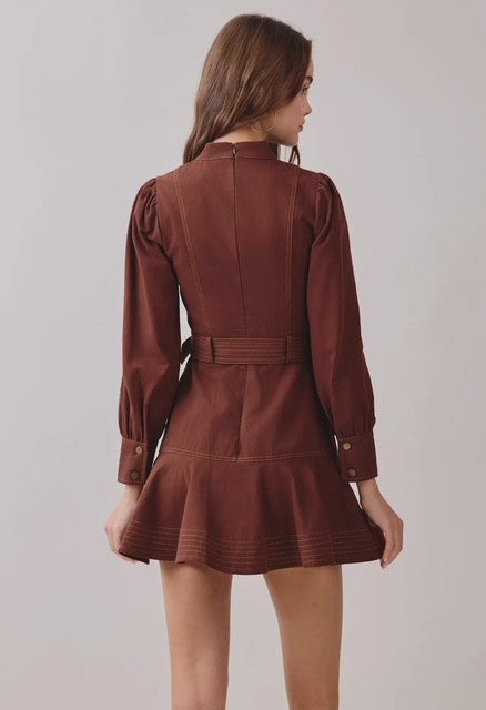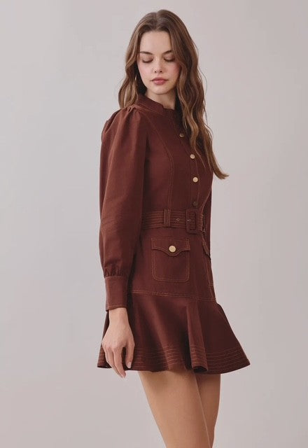 Chocolate long sleeve mock neck dress designed with understated sophistication. Features contrast topstitching that adds visual interest, a functional front button closure, and an adjustable belt to customize your silhouette. The mock neck provides a polished, layered look that works solo or under jackets. Crafted for effortless styling, this piece transitions seamlessly from casual weekdays to elevated evenings. Model pictured wears size small.