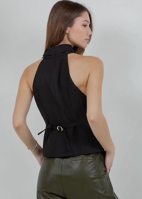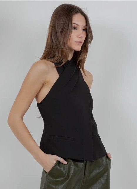 Black woven sleeveless halter top designed with a striking overlap front and cinching detail at the back for a refined silhouette. The halter neckline creates an effortless elegance, while the structured woven fabric holds its shape throughout the day. Perfect layered over basics or styled solo for an elevated look. Model pictured wears a size small.
