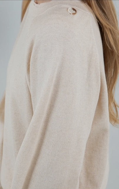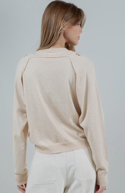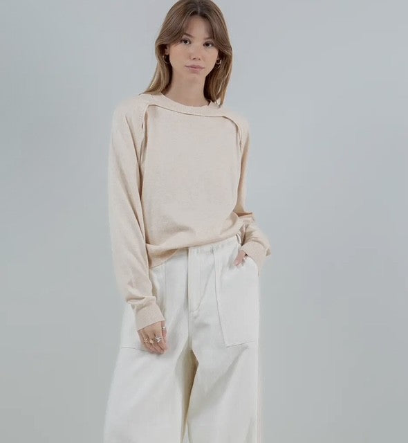 Cream knit top with bolero long sleeve layer hooked on with a button. This piece layers effortlessly over your favorite basics, adding instant dimension and movement. The detachable bolero sleeves give you versatility—wear them buttoned on for a polished look or remove them for a sleek, minimalist vibe. Crafted from soft knit fabric that moves with you, it's the kind of top that works as hard as you do, whether you're dressing up or keeping it casual. Model wears a size small.