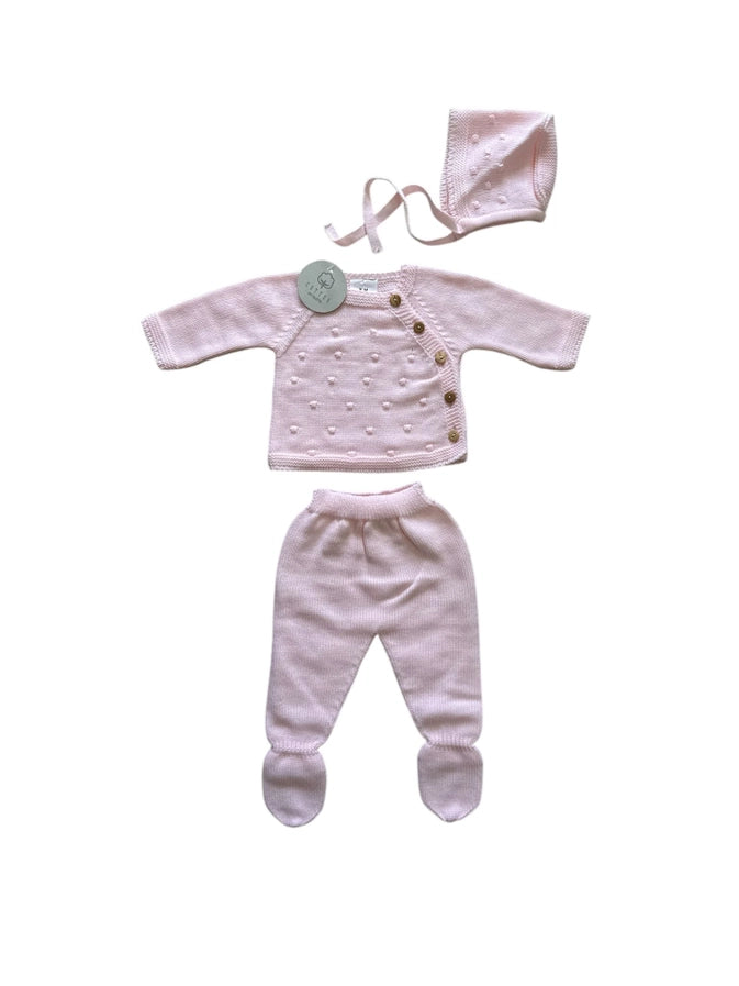 Dress your little one in cozy charm with this 3-piece baby knit set. Featuring a soft pink long-sleeve top with playful asymmetrical buttons, matching footie pants with a comfy elastic waist, and a snug hat to keep tiny heads warm. Perfect for cuddles and adventures alike!